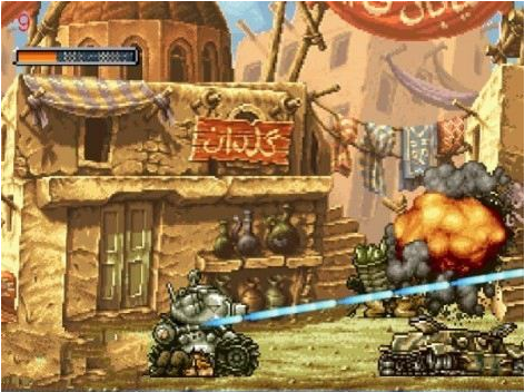 从系统来讲MS在一出场的时候就已经近乎完美。8方向跳跃射击、主枪火力品种全面、大威力抛物线手雷再加上近身速度极快的匕首攻击,一个全能型的兰博式主角诞生了。而每关必定出场的乘物——坦克兵器Metal Slug更是具备了明星所需要的一切要素,凡是见过这款游戏的人无不对这部Q版小坦克着迷——废话,有谁见过会跳着前进还会趴下的坦克.