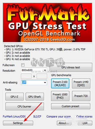 1、首先打开软件FurMark,关闭抗锯齿功能;