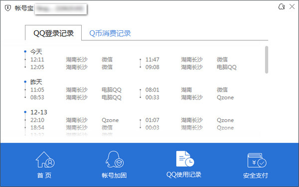检测文件和网址安全 一目了然异常记录全掌握 帐号宝中可便捷查看QQ登录记录、Q币消费记录