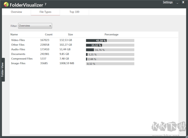 5、点击【file types】(文件类型)按钮,可以查看视频文件、音频文件、图片文件等各类不同文件在硬盘中的数量、大小、占比信息。