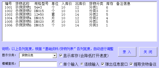 货物浏览窗口中列表的各列宽度,根据“系统设置/货物列表”各列宽度,自动调整。同时,还可以选择是否连续输入、是否弹出单价输入窗口等。