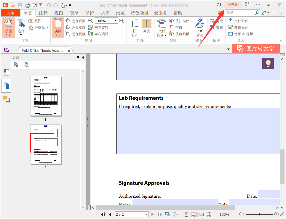 2、点击右上角的“未登录”,登录或注册福昕会员账号,在福昕阅读器领鲜版中使用PDF拆分、PDF合并等高级功能需要登录;