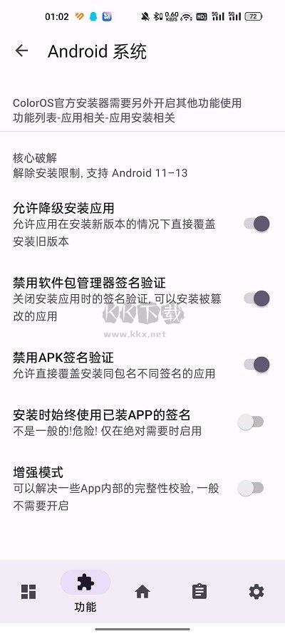 允许降级应用、禁用应用包管理器签名验证、禁用APK签名验证、使用已安装APP签名