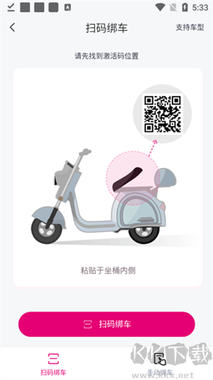 4、选择扫码绑定注意二维码在坐桶内测,也可以手动输入激活码或车架号绑定
