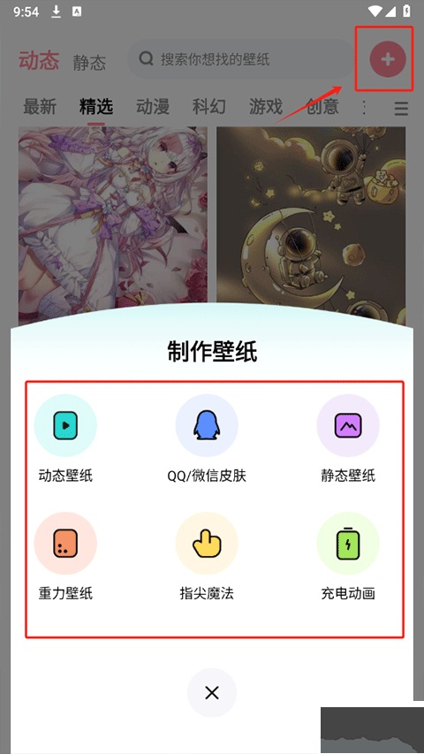 1、在app首页内点击右上角+号,并选择你要制作的壁纸类型,例如静态壁纸