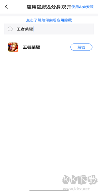 3、成功创建后,我们就可以搜索想要隐藏的应用软件,点击“解锁”;