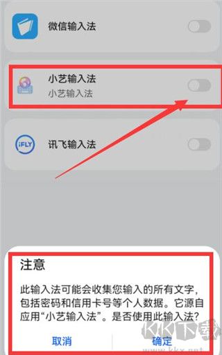 3、不用理会,直接点击“确定”,然后在下图中,选择“小艺输入法”,把它设置成默认输入法(我信也可以在手机设置的“系统和更新”里的“语言和输入法”里设置它为默认)。