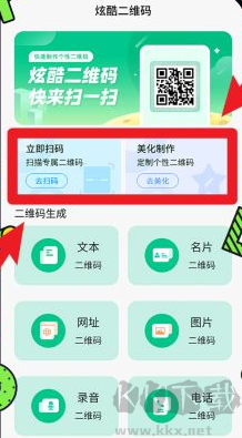 1、启动炫酷二维码制作,在主页点选所需二维码类别按钮,例如文字、链接或图片等。