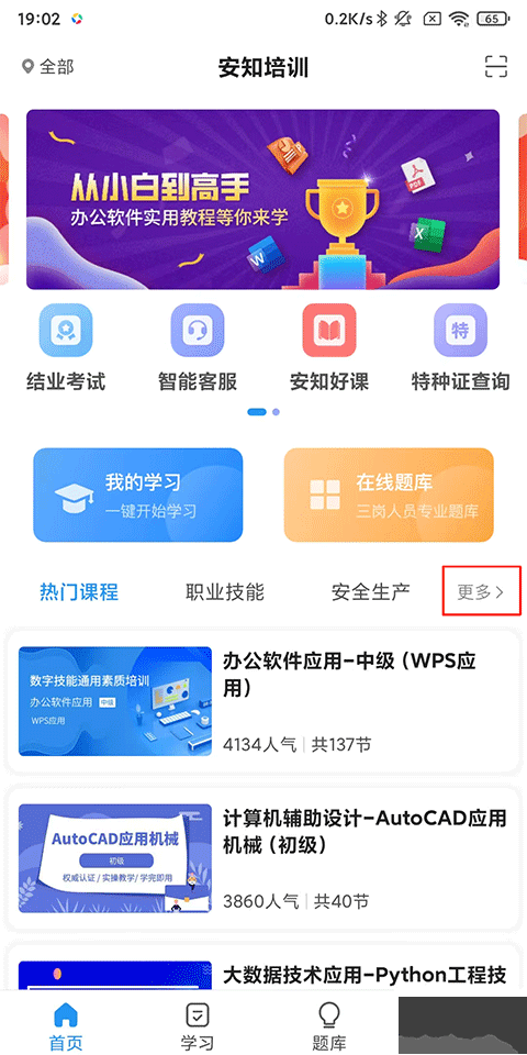 1、首页:提供结业考试、智能客服、安知好课、特种证查询等功能,还有我的学习、在线题库;