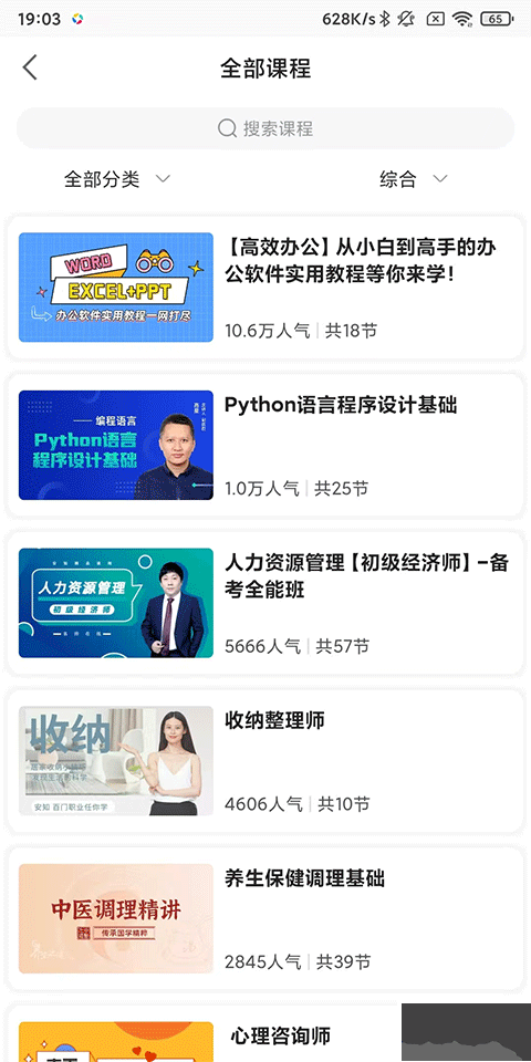 2、点击首页的更多来到全部课程页,这里涵盖了从Python语言到人力资源管理等课程内容,应有尽有;