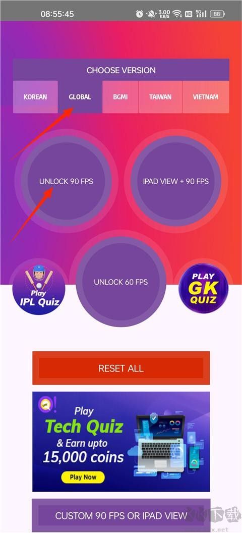 1、启动软件,选择“全局模式(GLOBAL)”,然后点击“解锁90帧模式”。