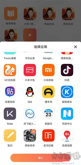 3、选择应用:点击【+】号添加按键后,会弹出手机中已安装的应用清单,在弹出窗口里选中需要多开的应用,点击勾选后确认选择。