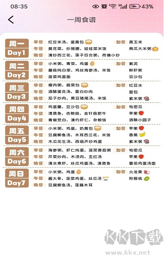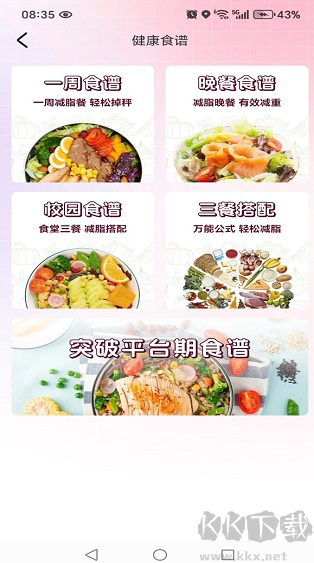 3、点击查看健康食谱,获取一周食谱、三餐搭配等多种饮食方案;