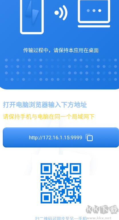4、手机与手机互传就用另一个手机扫描二维码,手机与电脑互传就打开电脑上的浏览器,输入下方地址,同步后即可传输文件。注意:多个设备要在同一个局域网下。