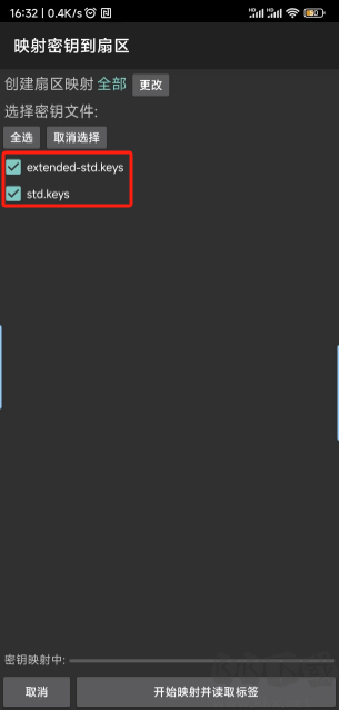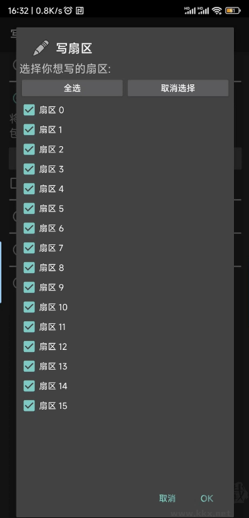 7.勾选此前存储的标签数据,选择完毕后点击底部“选择转储”进入下一步(此时将CUID空白卡放置于移动设备NFC感应区域);按需选择需要写入的扇区信息,然后点击底部“确定”开始最终的数据写入与模拟流程;