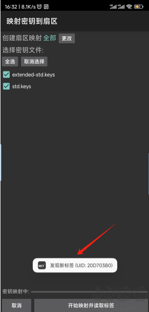 4.将门禁卡紧贴移动设备背部,建议保持静止勿移动,当屏幕下方出现“发现新标签(UID:……)”提示