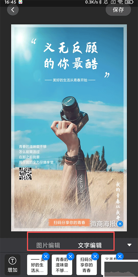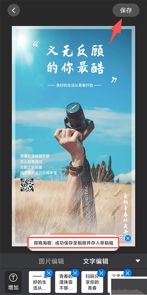 4、创作完成后点击右上角的保存按钮即可将海报以图片形式导出到本地相册中。