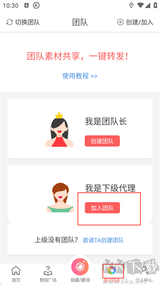 2、进入首页,点击最下方 【素材转发】,点击中间【加入团队】