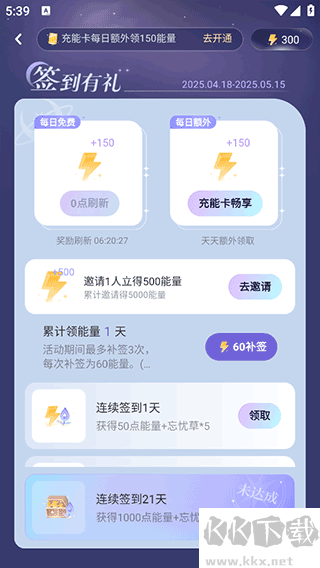 2、完成每日签到等指定动作,即可免费得到能量奖励。