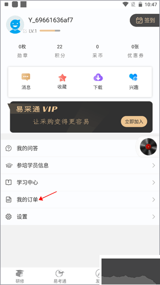 1、同样在易采通的 “我的” 功能板块中,找到并点击 “我的订单” 相关功能。
