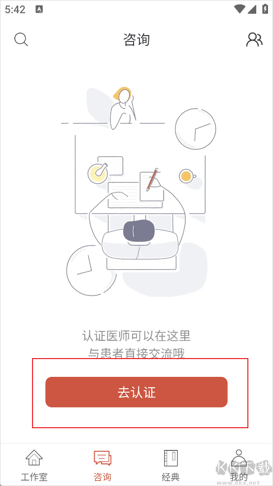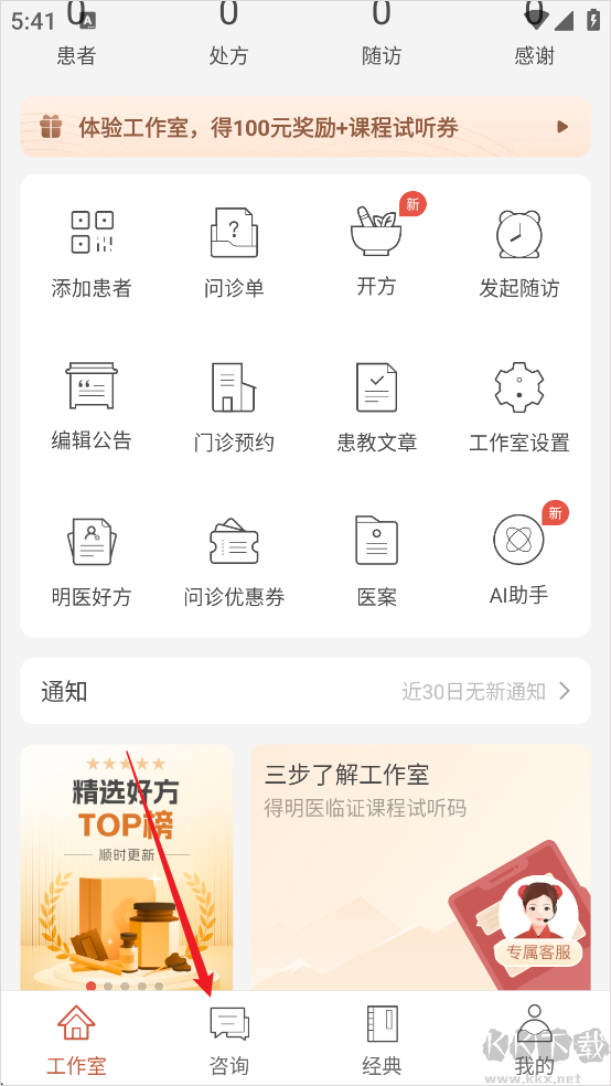 1、打开大家中医,登录您的医师账号后,点击底部导航栏的 “咨询” 入口。