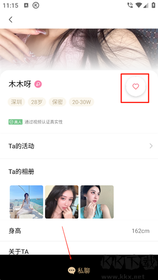 3、随后可以点击爱心等待对方发现你找你聊天,或者胆子大一点直接点击私聊