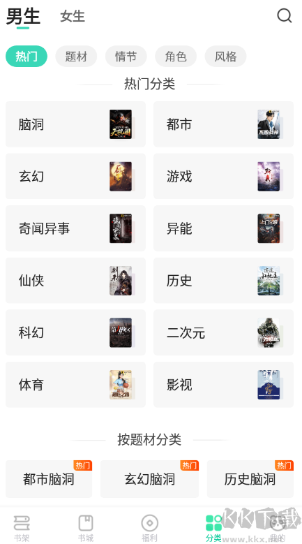 书籍按照男生和女生喜欢的分成二大类,其中还有热门、情节、角色等详细分类,帮你快速找到想看的书籍。