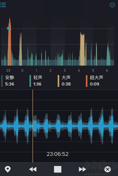 打开应用后点击底部【结果】选项,选择某一天的记录,在时间轴图表上点击任意打鼾段落即可播放对应的声音片段。