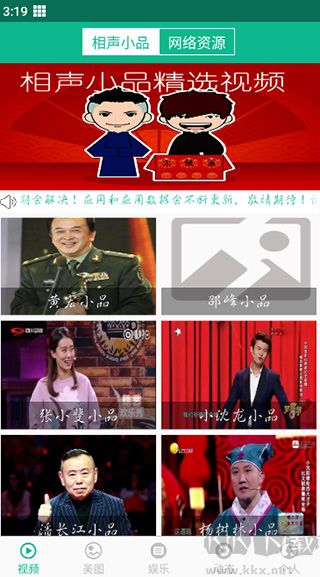 1、打开下载好的app,在视频栏目中有各种经典相声小品推荐;