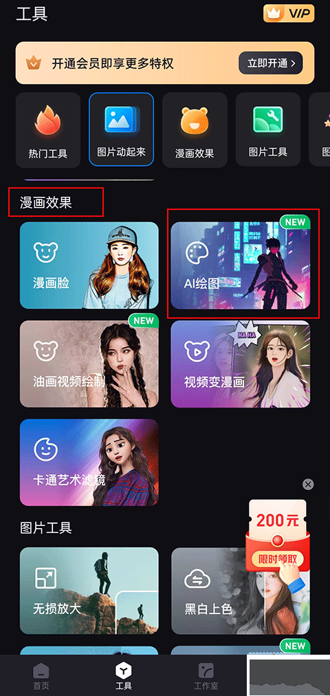 2、在工具模块,找到漫画效果,点击AI绘画;