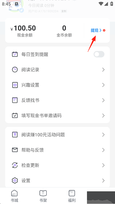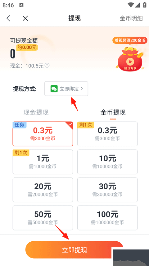 2、先绑定微信号,完成后选择金币/现金提现,提现金额等,最后点击立即提现。