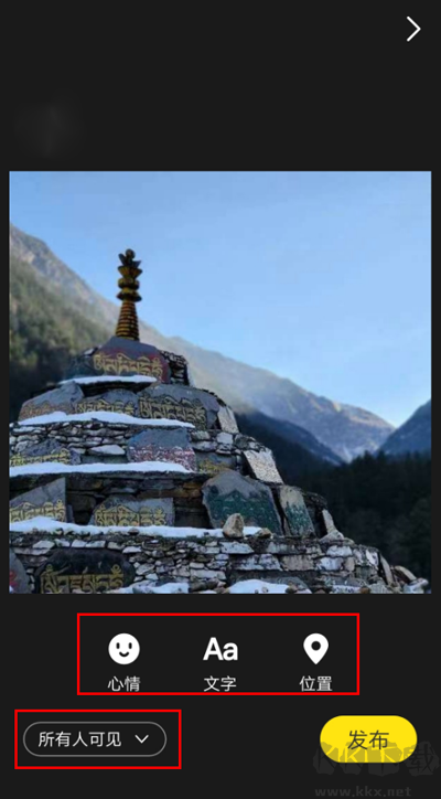 发布步骤:拍摄照片或从相册挑选照片 -> 在照片上标注心情、文字、地理位置,选择可见人群 -> 发布日记。