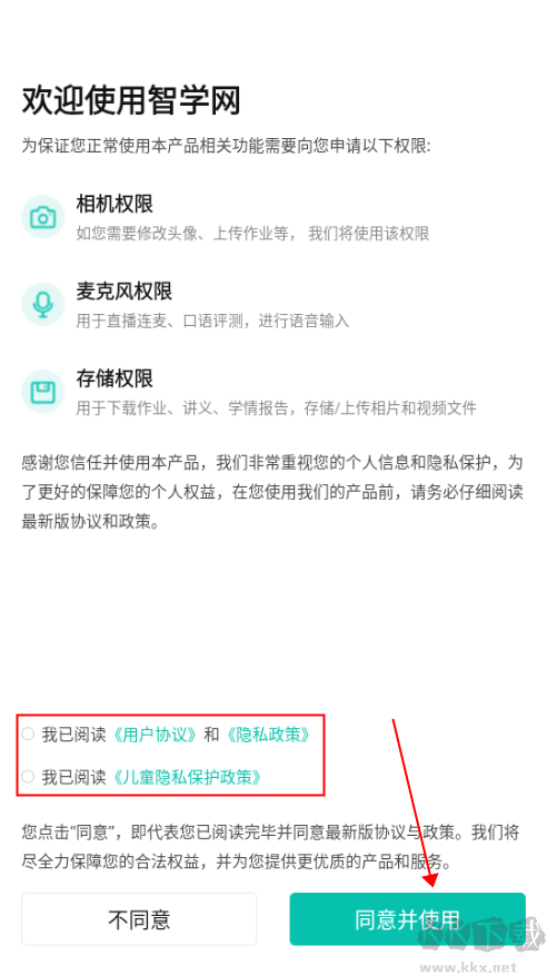 1、进入手机上的智学网APP,然后,点击下方的【同意并使用】。
