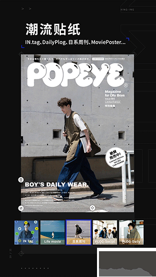 1、包含 IN.tag、DailyPlog、日系周刊、MoviePoster 等多种主题的态度文本贴纸。