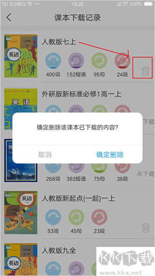 3、接着,你会看到自己所有下载过的课本记录,然后找到刚才无法收听的那本课本,点击垃圾桶图标删除。之后返回首页重新下载一次,就能正常使用了。