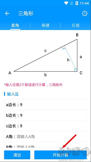 4、此处以三角形计算为例,输入相应的参数后,点击开始计算软件就会自动为你计算了。