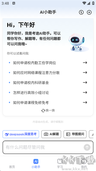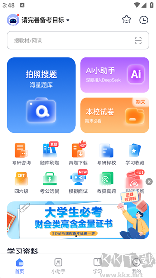 提供拍照搜题、AI小助手、本校试卷等功能入口,还有考研咨询、题库刷题、四六级、考公选岗等各类备考服务模块】。