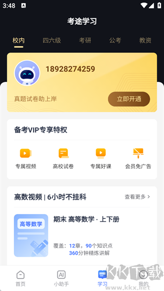 分为校内、四六级、考研、公考、教资等分类,开通VIP后提供备考VIP专享特权【专属视频、高校试卷等】,还有高数冲刺视频等学习资源。
