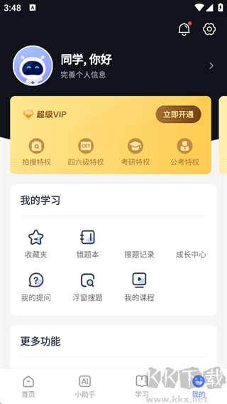 可完善个人信息,展示超级VIP特权【拍搜、四六级、考研、公考特权】,包含收藏夹、错题本、搜题记录、我的课程等学习相关功能入口,以及更多功能拓展区。