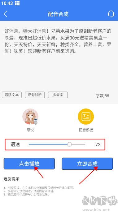 5、最后点击试听调整合适的语速,当你觉得满意后点击立即合成即可完成这段文字转语音了。