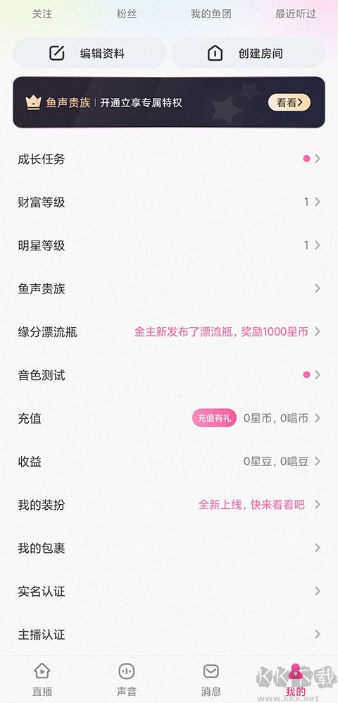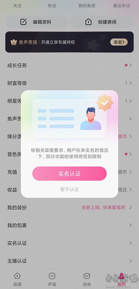 1、在鱼声app开通直播需要先进行【实名认证】。