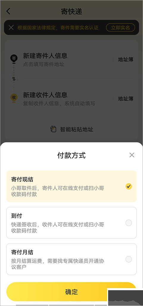 1、打开韵达快递app后,点击寄快递,系统提示根据法律规定,寄件要先完成实名认证,我们可以选择微信快速授权快速实名。