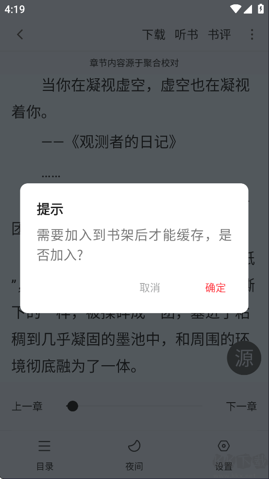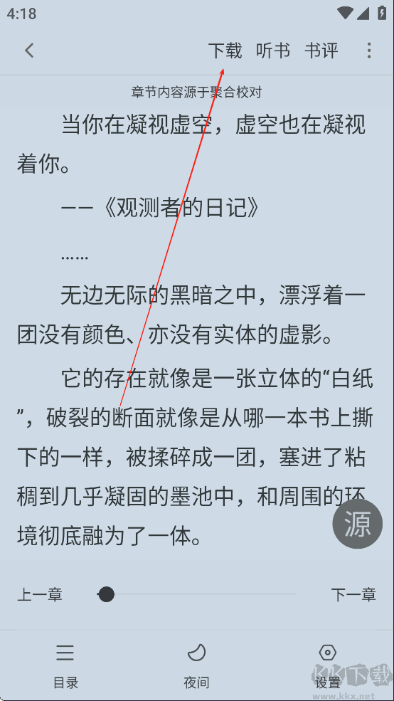 进入阅读界面之后,点击屏幕中央唤起功能键,然后点击下载