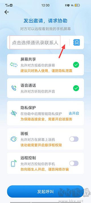 3、轻触选取通讯录好友,选定你希望操控设备的对象。