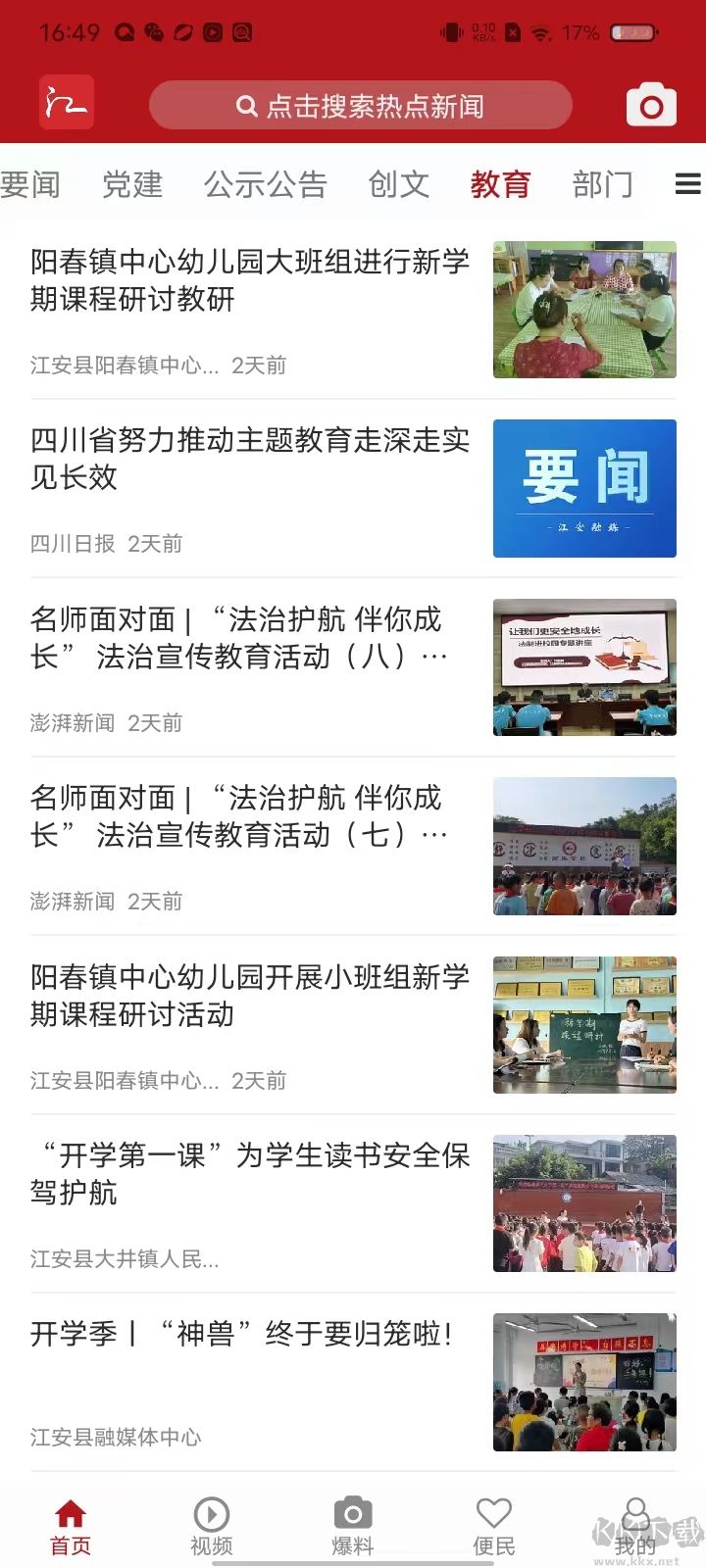 1、首先,完成应用程序获取与安装后,点击图标进入主界面。首页呈现江安县最新动态与消息,内容划分为不同版块,例如党政建设、学校教育、卫生健康及日常服务等。通过顶部搜索框,可直接查找关注的热点内容。