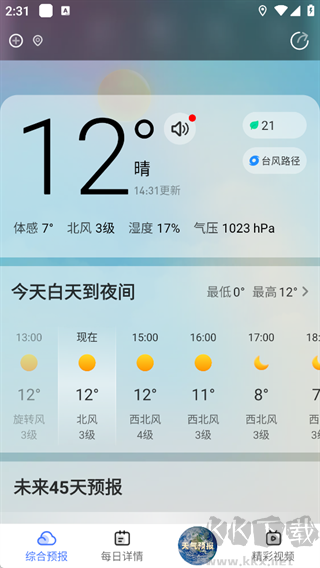根据你的定位实时展示天气状况,并提供体感温度、风向风力、湿度、气压等详细数据帮助用户全面掌握天气变化。