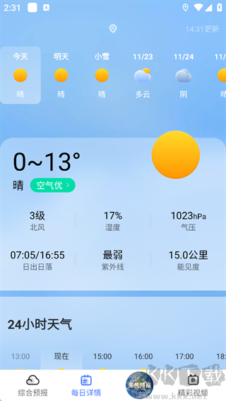 可查看今日及未来几日天气,包含气温范围、空气质量、日出日落、紫外线、能见度等信息,以及24小时天气变化,满足用户对天气细节的查询需求。