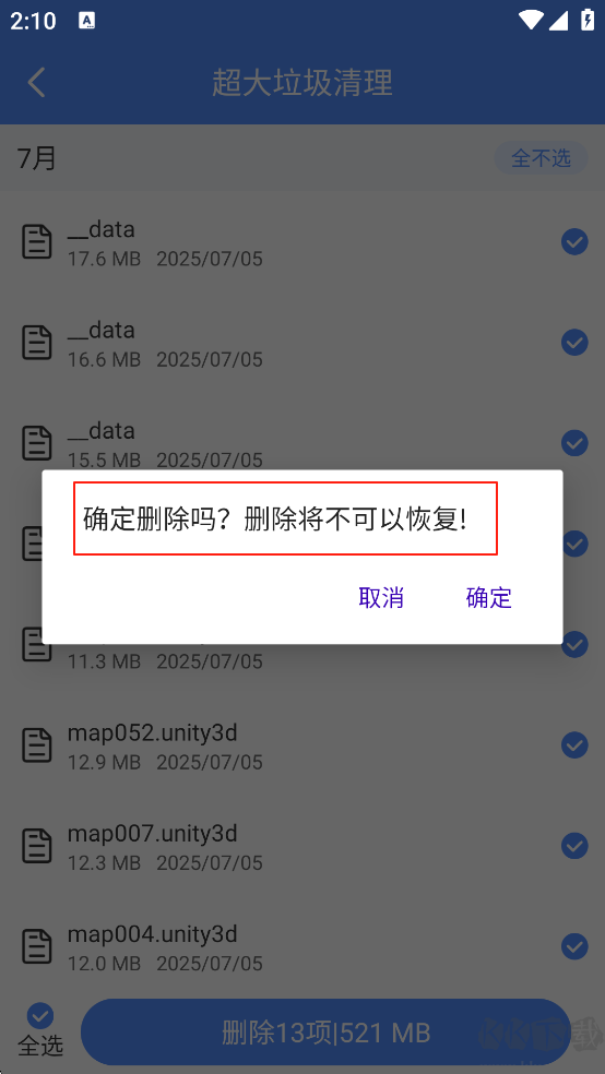 4、大体积垃圾,智能识别筛选——自动扫描手机中占用空间较大的无用文件,如重复安装包、废弃视频、临时缓存等,并提供智能建议,助你精准清理。