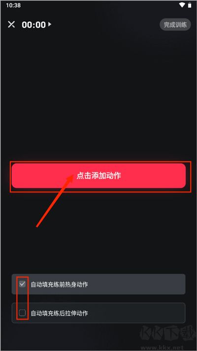 2、选择“添加动作”,如果需要热身拉伸就勾选下面选项就行了。