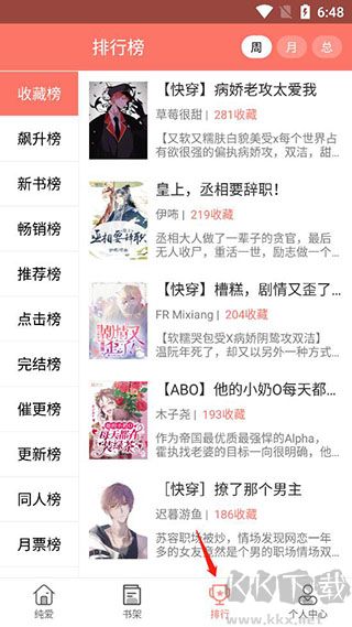 6、此外在排行榜中还可以发现周、月、总的各个榜单,让你不会错过大家都喜欢看的小说;